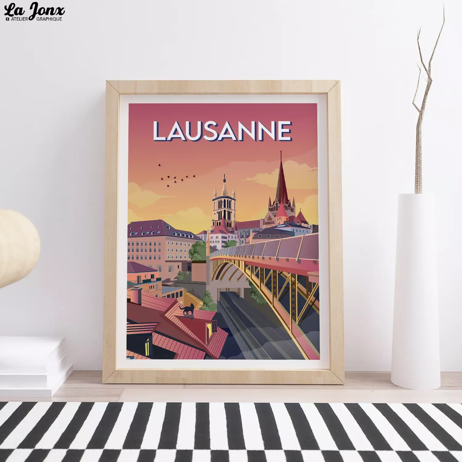 Cette affiche / Poster de Lausanne est imprimée en Suisse 🇨🇭 sur du papier de qualité et éco-responsable. Elle s’intègrera parfaitement à votre décoration murale et constitue également une idée parfaite de cadeau suisse. Ce poster artistique met en valeur la ville de Lausanne, ville suspendue, nichée au bord du lac Léman avec pour horizons les Alpes et le Jura.