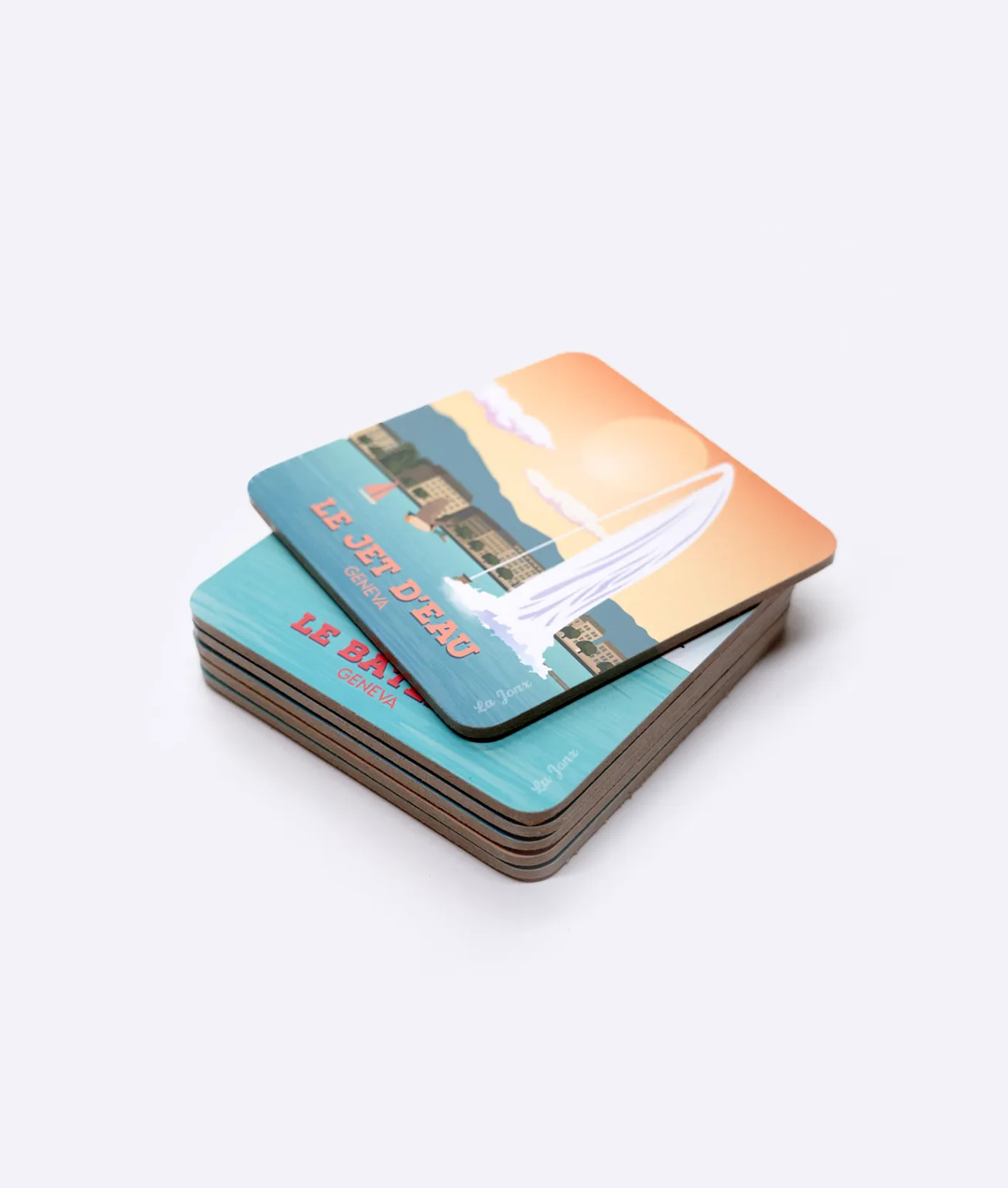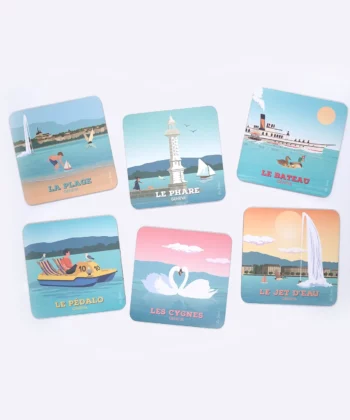 A La Jonx, nous avons décidé de remettre ceux-ci à l’hotel à travers cette série de 6 sous-verres illustrés de Genève.